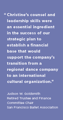 to the San Francisco Ballet's $13 million capital campaign. Christine worked with members of the Capital Campaign Committee to identify new funding prospects, solicit gifts from